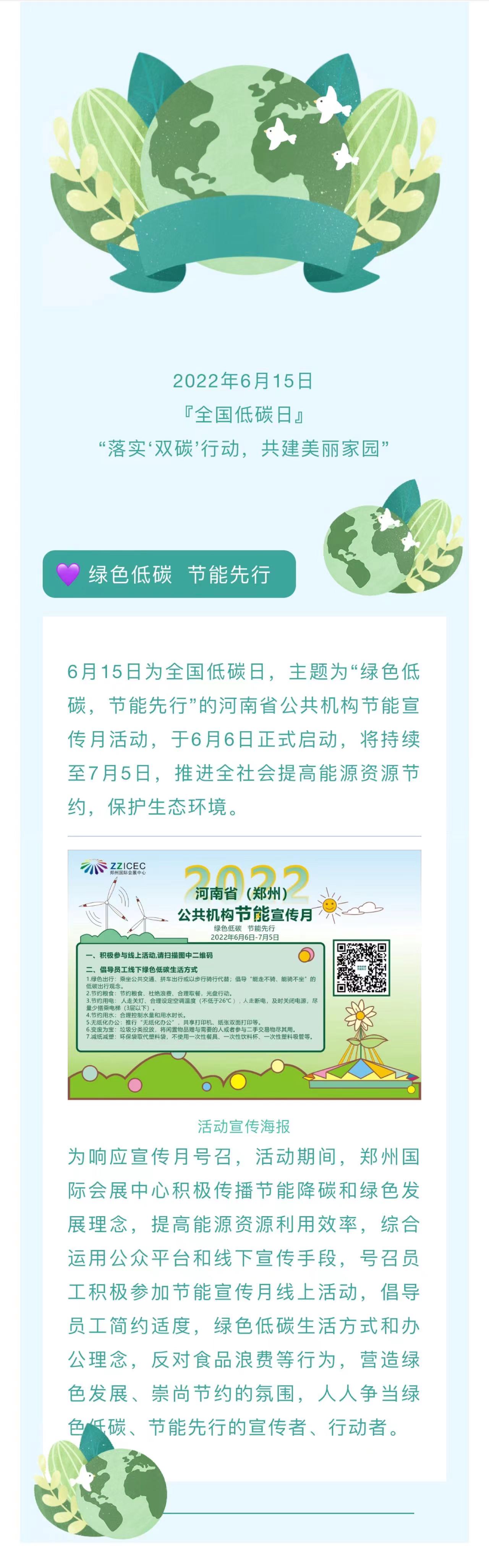 6月15日為全國低碳日,主題為“綠色低碳,節(jié)能先行”的河南省公共機構(gòu)節(jié)能宣傳月活動,于6月6日正式啟動,將持續(xù)至7月5日。為響應(yīng)宣傳月號召,活動期間,鄭州國際會展中心積極傳播節(jié)能降碳和綠色發(fā)展理念,提高能源資源利用效率,綜合運用公眾平臺線和線下宣傳手段,號召員工積極參加節(jié)能宣傳月線上活動,倡導(dǎo)員工簡約適度,綠色低碳生活方式和辦公理念,反對食品浪費等內(nèi)容,營造綠色發(fā)展、崇尚節(jié)約的氛圍,人人爭當(dāng)綠色低碳、節(jié)能先行的宣傳者、行動者、引領(lǐng)者。
