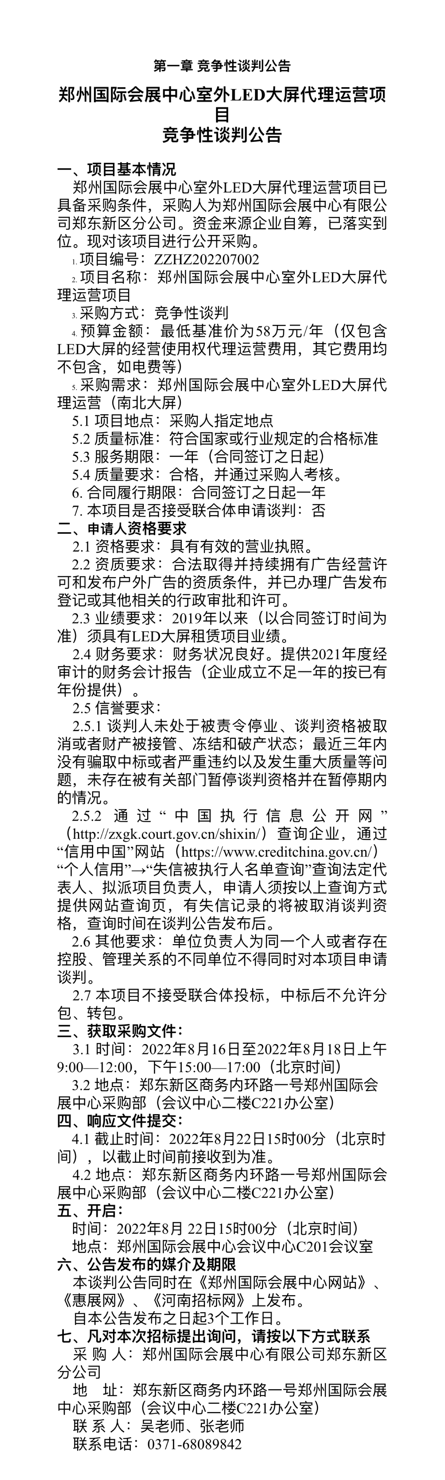 鄭州國際會(huì)展中心室外LED大屏代理運(yùn)營項(xiàng)目 競爭性談判公告