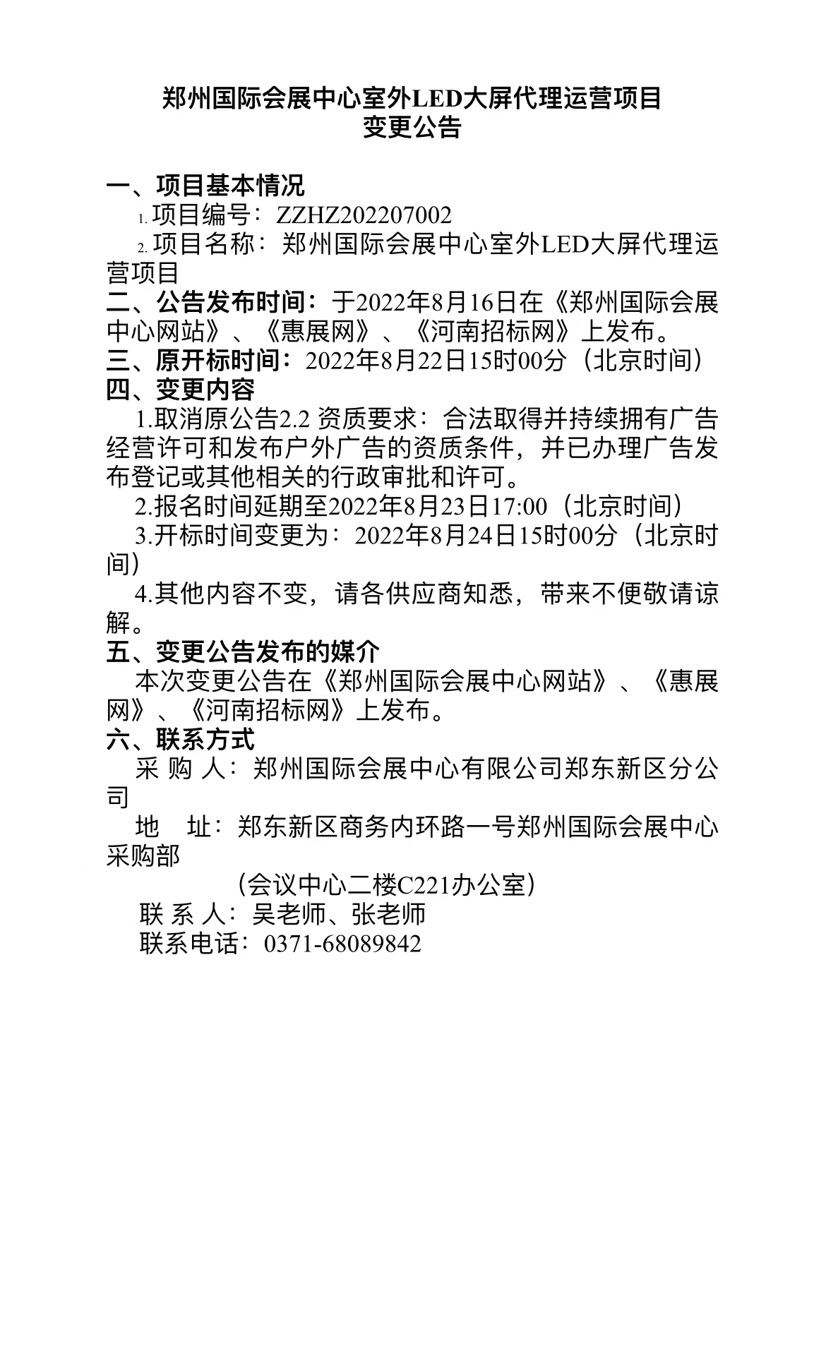鄭州國際會展中心室外LED大屏代理運(yùn)營項(xiàng)目 變更公告