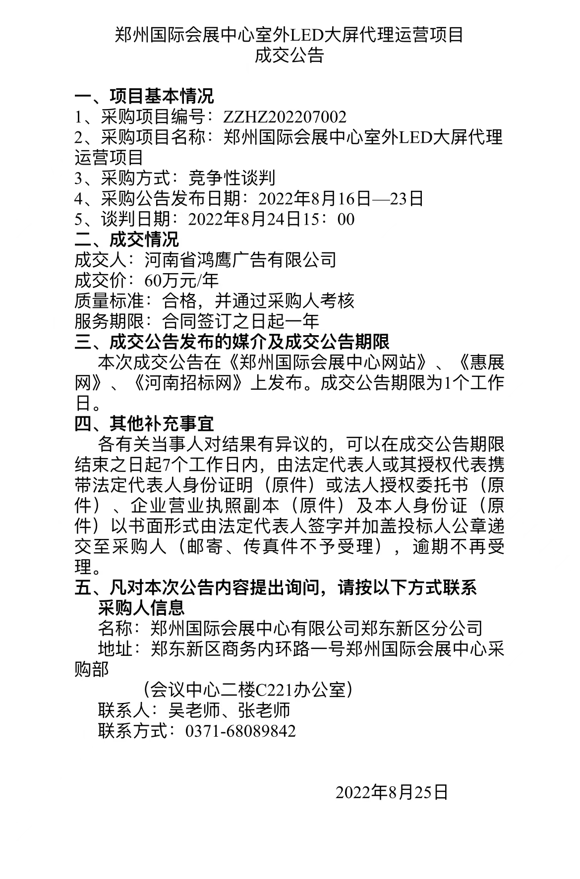 鄭州國際會展中心室外LED大屏代理運(yùn)營項(xiàng)目 成交公告