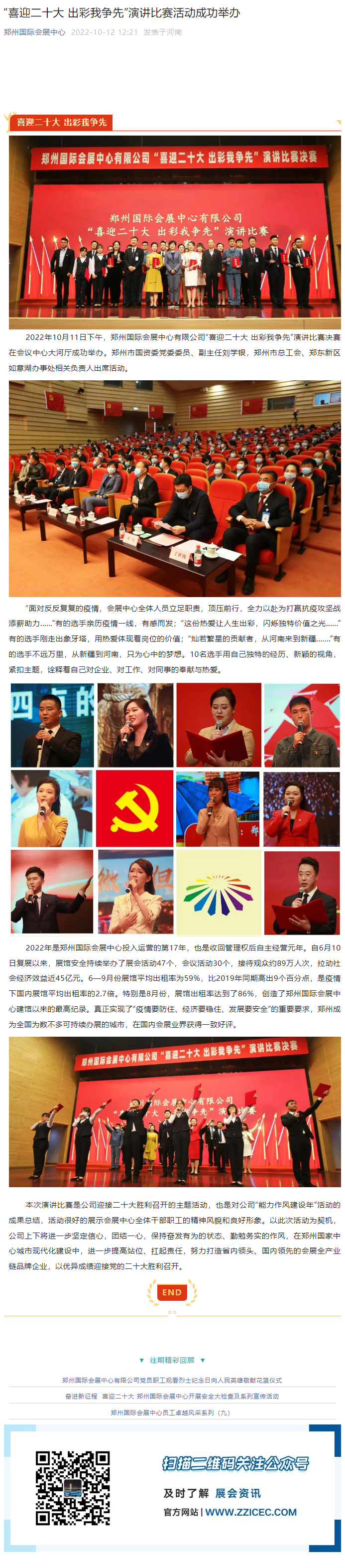 首頁新聞中心展會新聞文章詳情 文章詳情 “喜迎二十大 出彩我爭先”演講比賽活動成功舉辦 2022年10月11日下午,鄭州國際會展中心有限公司“喜迎二十大 出彩我爭先”演講比賽決賽在會議中心大河廳成功舉辦。鄭州市國資委黨委委員、副主任劉學銀,鄭州市總工會、鄭東新區(qū)如意湖辦事處相關負責人出席活動。