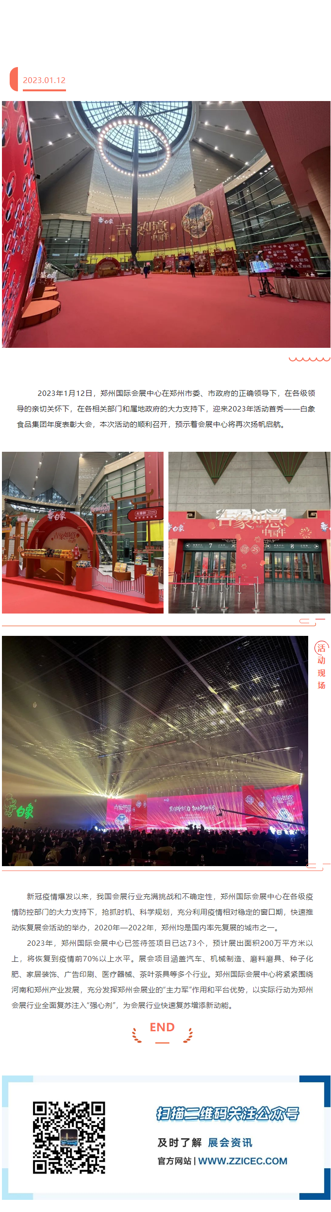 2023年1月12日,鄭州國(guó)際會(huì)展中心在鄭州市委、市政府的正確領(lǐng)導(dǎo)下,在各級(jí)領(lǐng)導(dǎo)的親切關(guān)懷下,在各相關(guān)部門和屬地政府的大力支持下,迎來(lái)2023年活動(dòng)首秀——白象食品集團(tuán)年度表彰大會(huì),本次活動(dòng)的順利召開(kāi),預(yù)示著會(huì)展中心將再次揚(yáng)帆啟航。