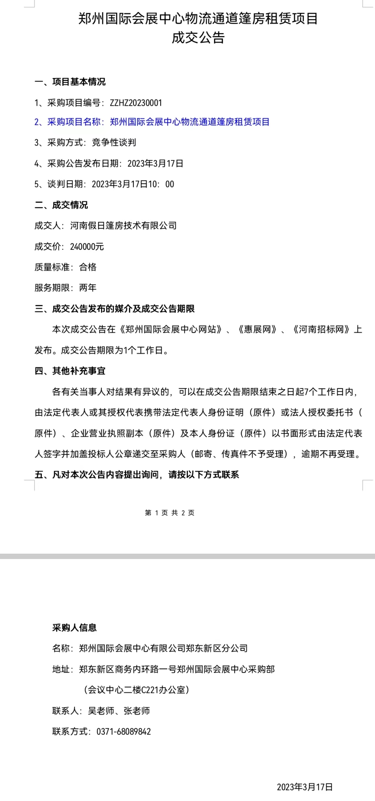 鄭州國際會展中心物流通道篷房租賃項目 成交公告