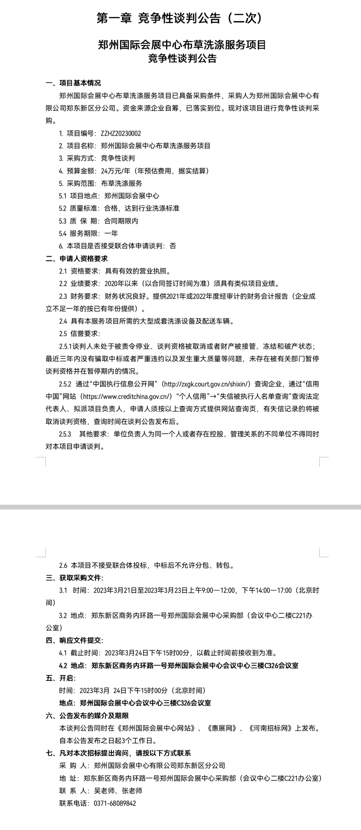 鄭州國(guó)際會(huì)展中心布草洗滌服務(wù)項(xiàng)目 競(jìng)爭(zhēng)性談判公告(二次)