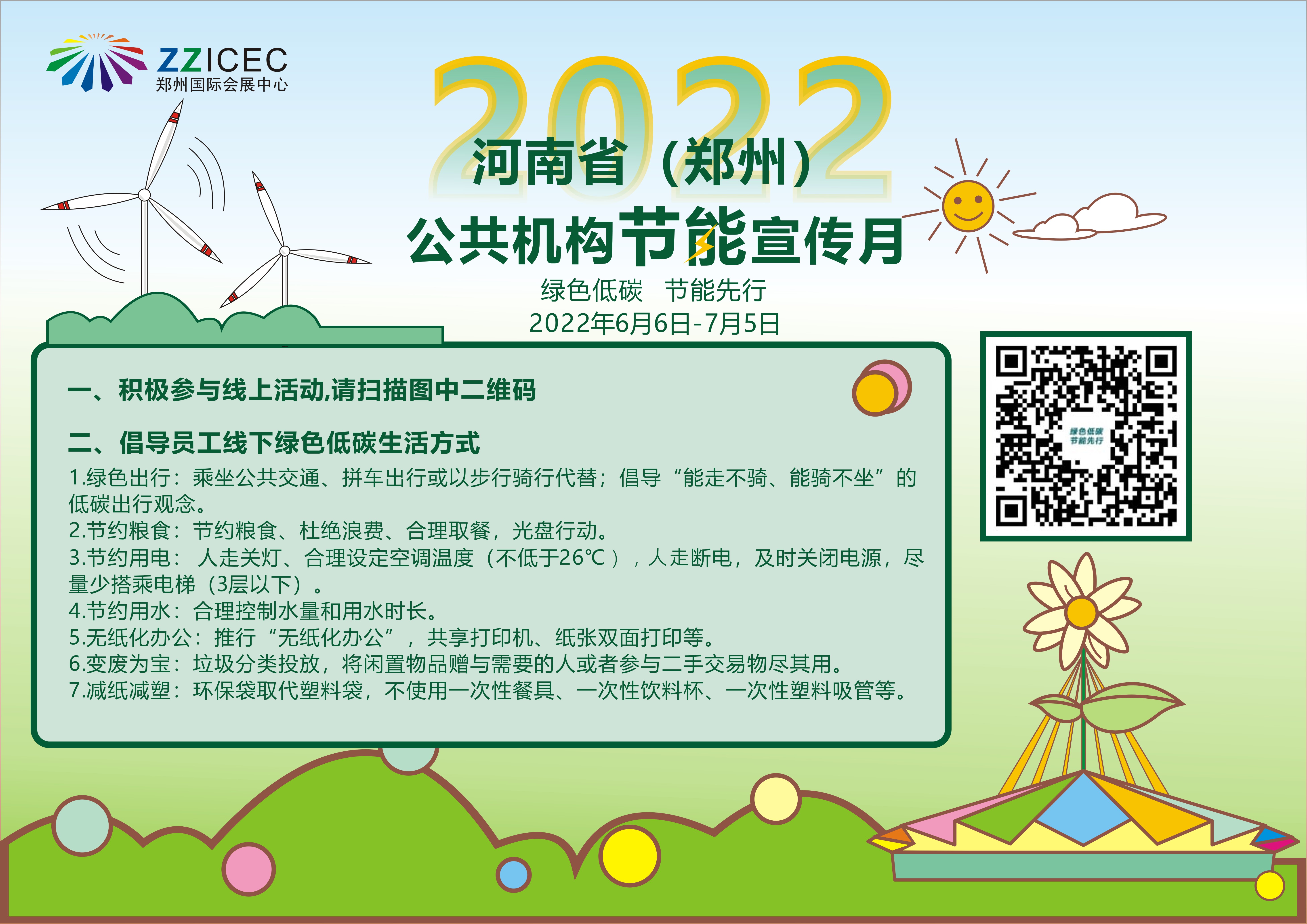 6月15日為全國低碳日,主題為“綠色低碳,節(jié)能先行”的河南省公共機(jī)構(gòu)節(jié)能宣傳月活動,于6月6日正式啟動,將持續(xù)至7月5日。為響應(yīng)宣傳月號召,活動期間,鄭州國際會展中心積極傳播節(jié)能降碳和綠色發(fā)展理念,提高能源資源利用效率,綜合運(yùn)用公眾平臺線和線下宣傳手段,號召員工積極參加節(jié)能宣傳月線上活動,倡導(dǎo)員工簡約適度,綠色低碳生活方式和辦公理念,反對食品浪費(fèi)等內(nèi)容,營造綠色發(fā)展、崇尚節(jié)約的氛圍,人人爭當(dāng)綠色低碳、節(jié)能先行的宣傳者、行動者、引領(lǐng)者。